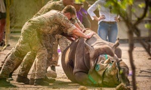 (Image Credit: The Guardian. Counter-poaching troops are transporting a black rhino from South Africa to Malawi.)
